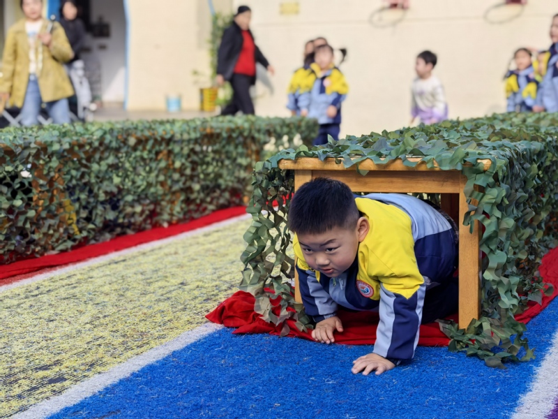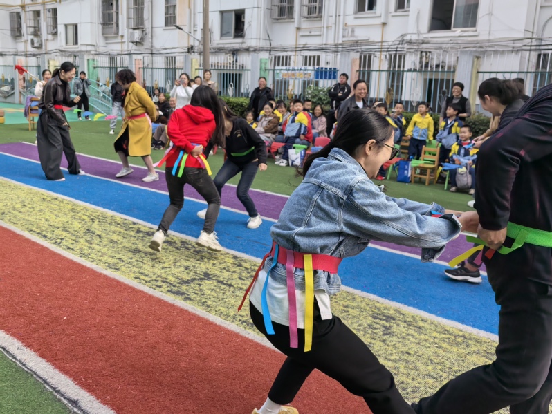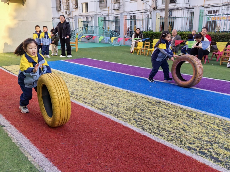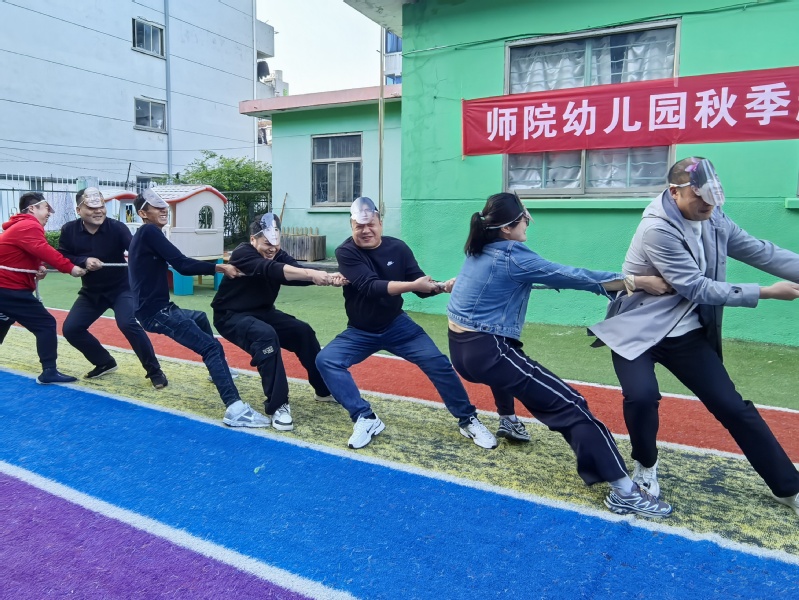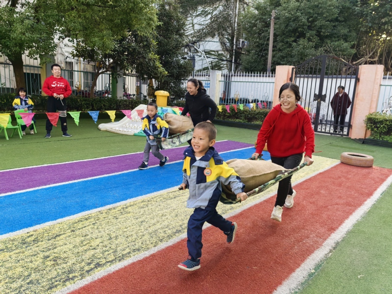 根据孩子的年龄、兴趣和动作发展特点,结合安全性、趣味性、娱乐性等要求,本次运动会共设幼儿个人项目《穿越火线》《翻转时空》、家长个人项目《滚铁环》《揪尾巴》和亲子项目《红旗飘飘》《轮胎大力士》《过河搭桥》《运粮》等。在幼儿个人项目中,通过钻、爬、跑、跳、跨等动作越过重重障碍,孩子们你追我赶,谁也不服输;家长个人项目中,大家忘记了年龄、忘记了烦恼,敏捷躲闪、奋力拼搏;亲子项目中,家长和孩子们配合默契、携手同进;最后当家长们戴上面具,一场全园性的明星表演“拔河比赛”再次将活动掀起了高潮,幼儿园的操场上欢呼声、呐喊声此起彼伏。家长们笑出了眼泪,说:“仿佛又回到了童年时光”。