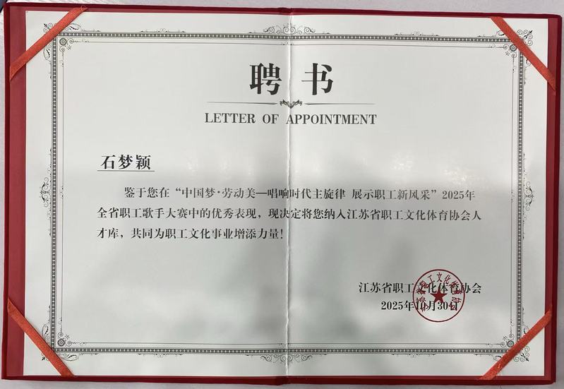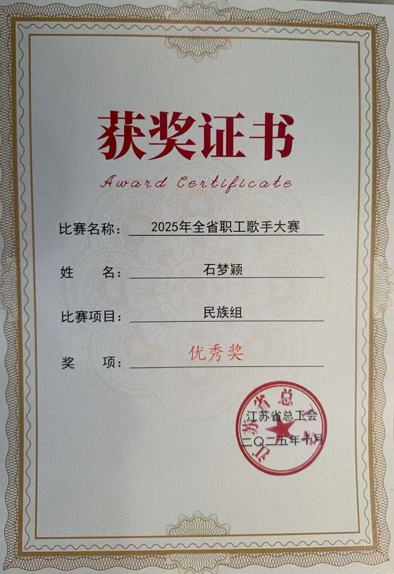 近日获悉,我校幼儿园教师石梦颖经过层层选拔,代表盐城市总工会参加在镇江举行的“中国梦·劳动美一唱响时代主旋律展示职工新风采”2025年全省职工歌手大赛。她凭借自己出色的演唱技巧,被省总工会授予民族组优秀奖称号,并成功纳入江苏省职工文化体育协会人才库。