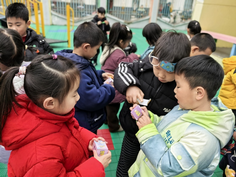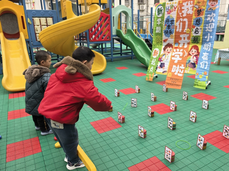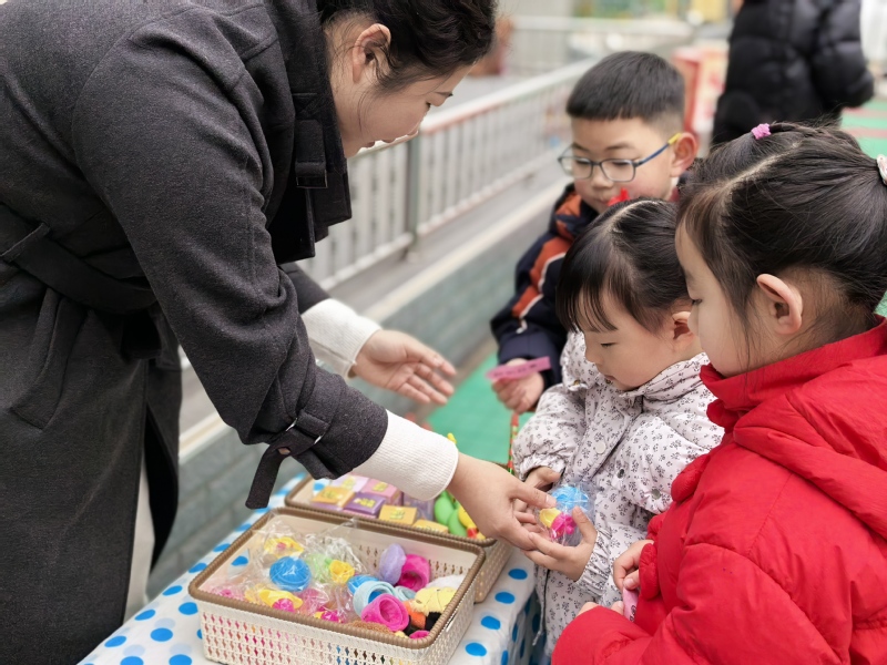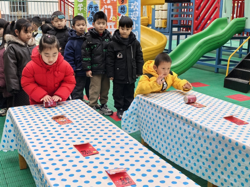 3月5日上午9:30,在老师的组织下,孩子们“套彩头”。当小小的套圈扔出,套中了“柿柿如意”“快乐番倍”“大柚作为”“樱有尽有”“薯你最棒”等图片时,孩子们高兴地和同伴击掌、和老师比心。